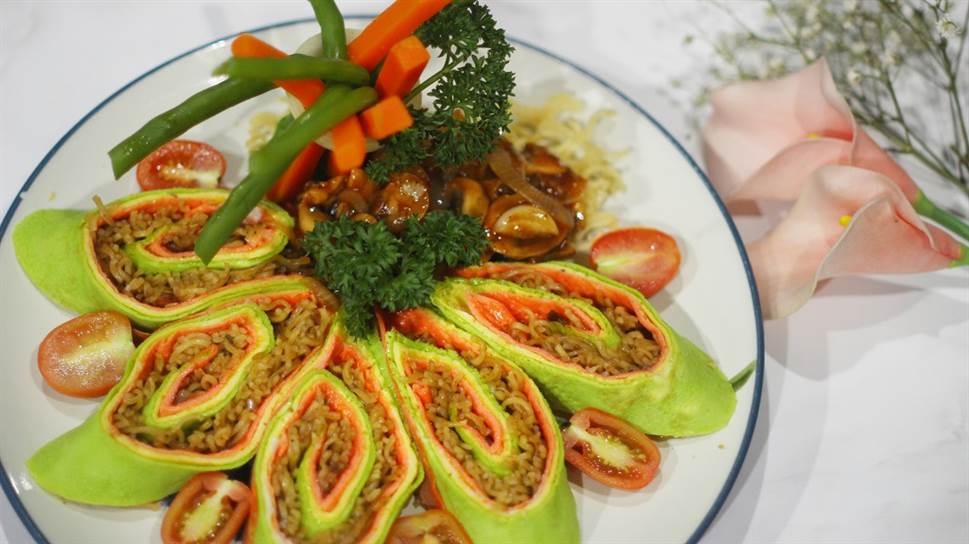 INDOMIE AGLIO OLIO RAINBOW ROLL WITH CHICKEN & MUSHROOM BBQ