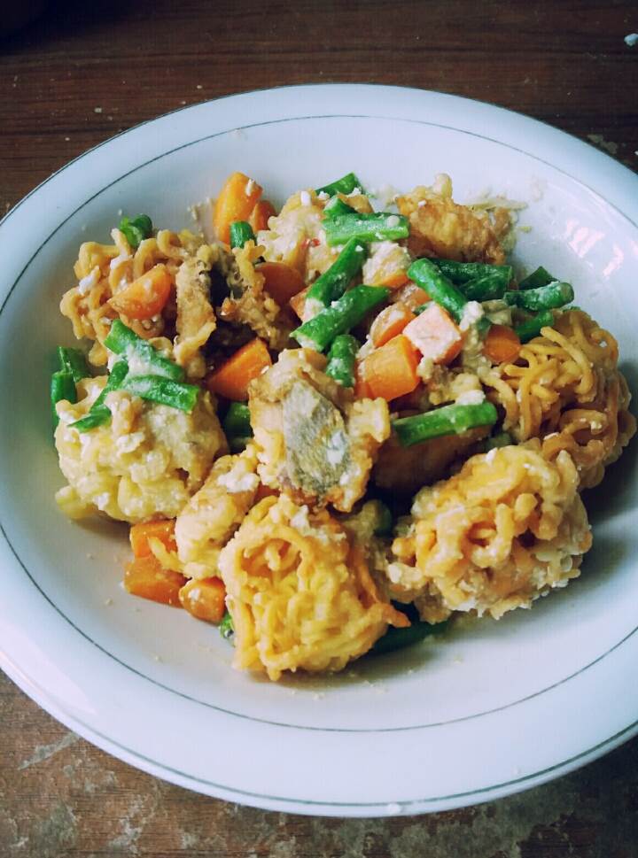 Noodle ball and kakap fillet with egg salted sauce