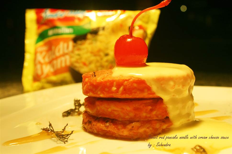 sweet red pancake noodle with cream cheese sauce (pancake mie manis berwarna merah dengan saus keju krim)