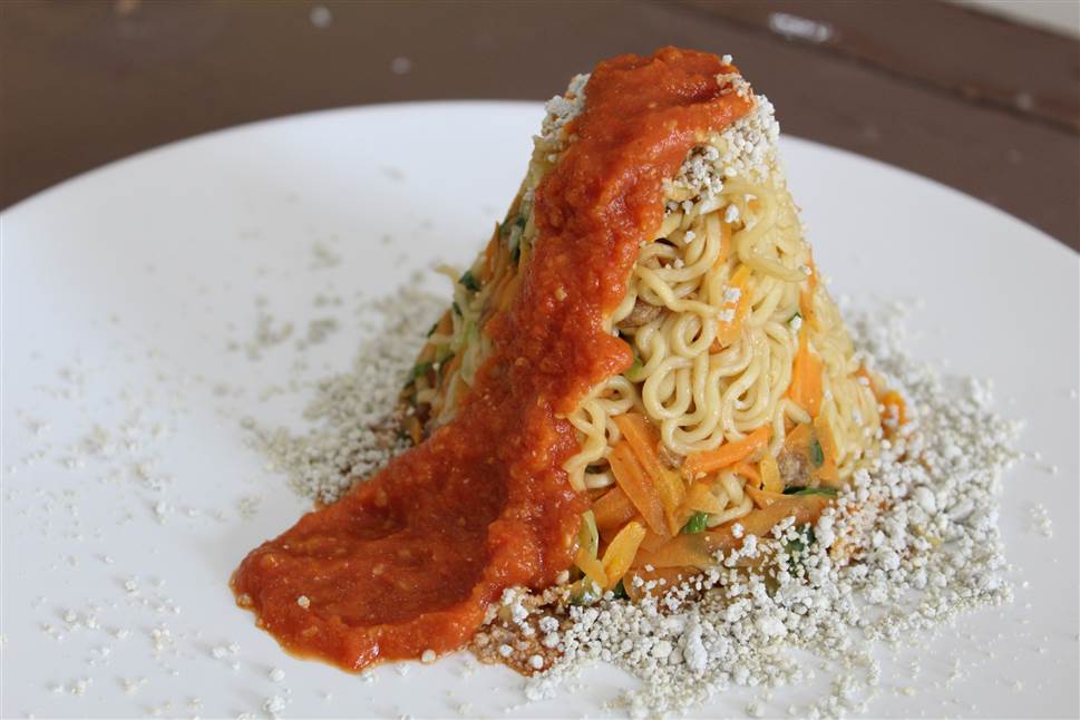 Smoked Volcano Indomie Noodle with Spicy Sauce and Edible Sand