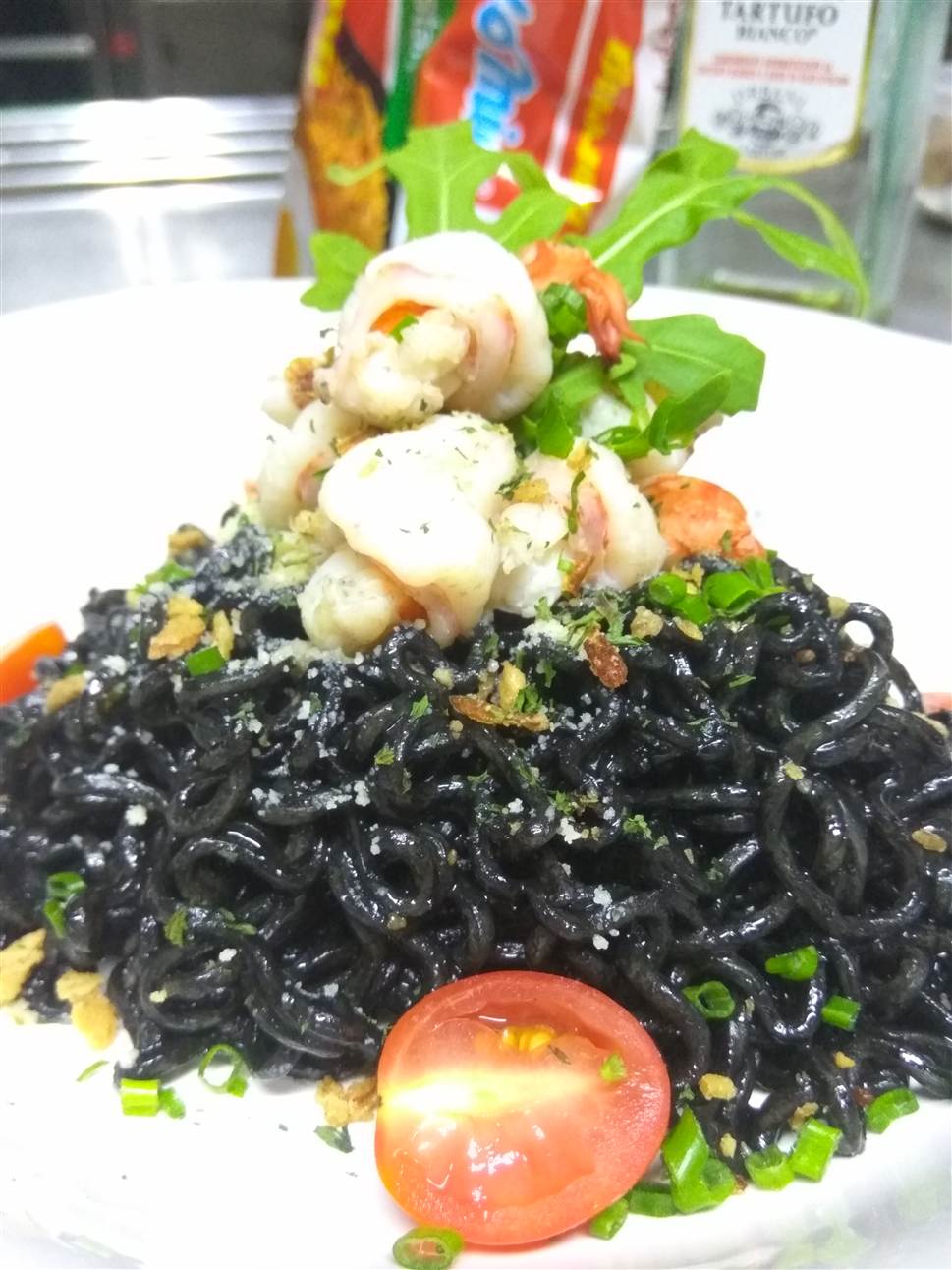 Squid ink indomie goreng with prawn