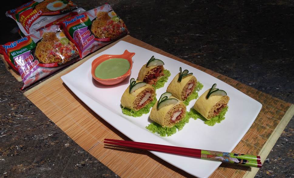 SUSHI MIE AYAM MERAH DENGAN PUREE KACANG POLONG