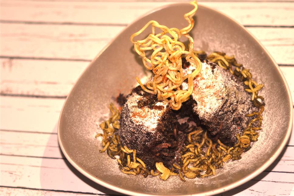 Indomie Spicy Chocolate Cake with Honey Glazed Crisp and Matcha Crumble