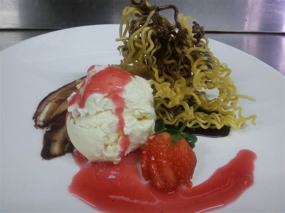 fried noodle with ice cream and chocolate sauce